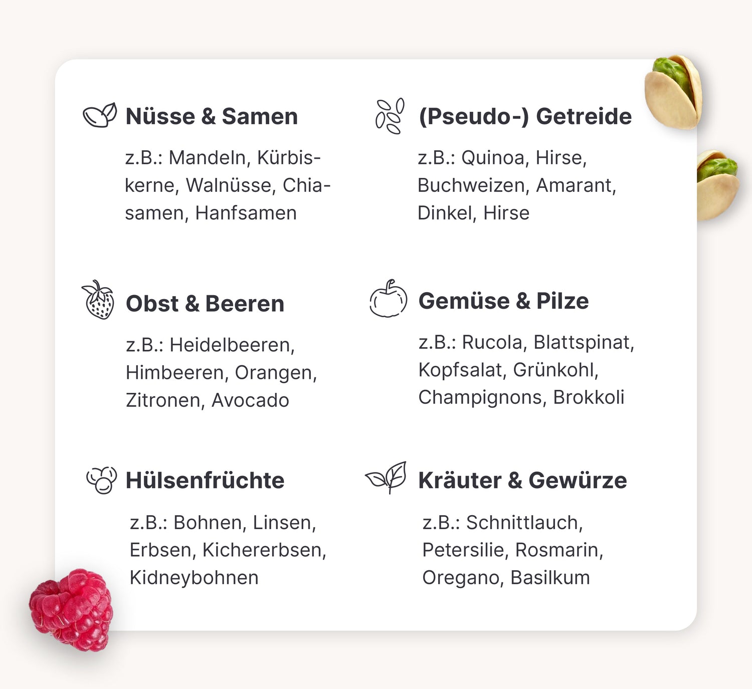 Du kannst die 30 Plant Points mit Lebensmitteln aus sechs Kategorien erreichen: