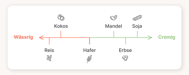 Reis-Drinks bestehen überwiegend aus Wasser und Reis und haben einen leicht süßen Geschmack. Ihr dezenter, süßlicher Geschmack macht sie vielseitig einsetzbar, obwohl ihre Konsistenz nicht so cremig ist wie bei anderen Alternativen. Sie eignen sich weniger gut zum Aufschäumen