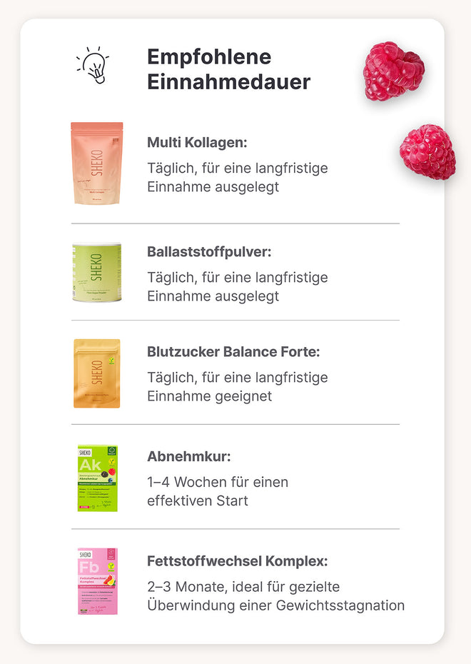 Jedes unserer Supplements hat seine eigene ideale Einnahmedauer, um bestmögliche Ergebnisse zu erzielen. Multi Kollagen, Ballaststoff Pulver und Blutzucker Balance Forte kannst Du dauerhaft verwenden, unabhängig davon, ob Du gerade abnehmen möchtest oder nicht. Sie sind wie kleine Alltagshelden, die Dich rundum unterstützen.