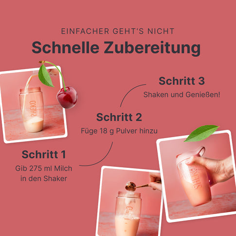 Your shake is ready in just three steps: Pour 275 ml of milk (1.5% fat) into the shaker. Add 18 g powder (approx. 2 heaped tablespoons or 2 level measuring spoons). Shake everything well. Enjoy!