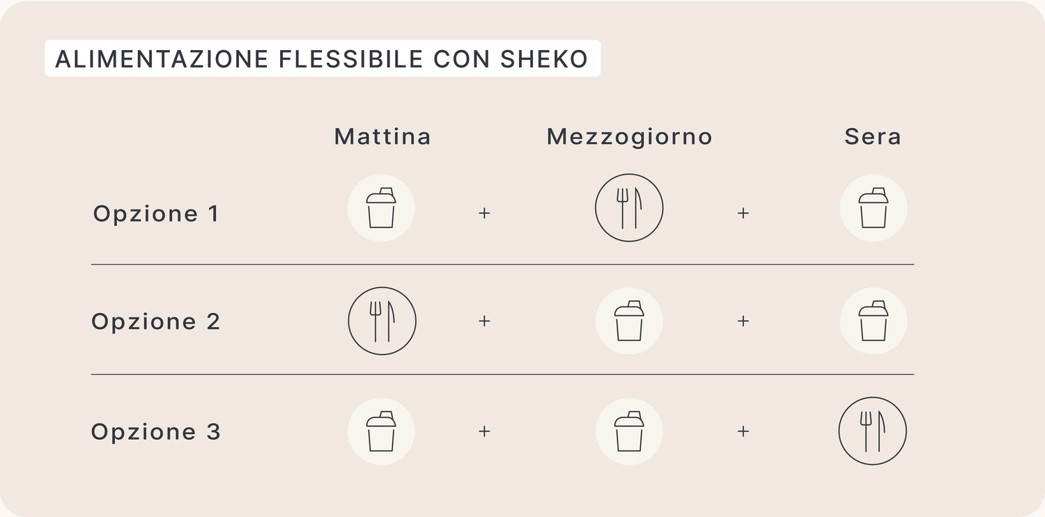Una cosa è certa: ognuno ha esigenze diverse, e questo è un bene! Il grafico spiega come si possa regolare a piacimento l’assunzione dei frullati. Se ami la colazione ricca, puoi bere il tuo frullato SHEKO la sera o a pranzo quando hai meno tempo, dato che fornisce tutti i nutrimenti necessari anche a metà giornata. Se vuoi sostituire uno o due pasti con il frullato, puoi farlo, dipende da te. infatti, sei tu a decidere cosa ti