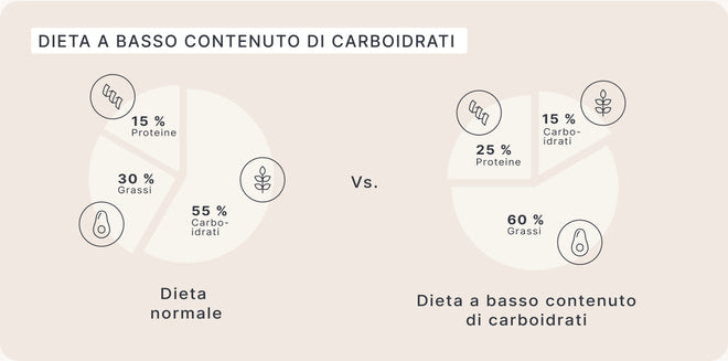 Tutte le ricette low-carb riducono l'apporto di carboidrati. Questo è chiaro. Tuttavia, non esistono regole universali. Alcune persone eliminano quasi completamente i carboidrati. Altri riducono solo di poco la quantità e continuano a mangiare porzioni normali. Non essendoci limiti precisi, il concetto può essere piuttosto confuso a prima vista. Il diagramma seguente mostra un esempio di come può essere suddivisa la dieta in termini percentuali in una dieta a basso contenuto di carboidrati.