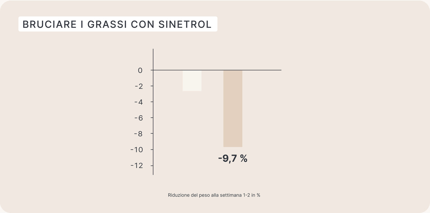Volete sapere come? Allora indossate il camice da laboratorio e tirate fuori gli appunti, ora si fa un po' di scienze: i principi attivi di Sinetrol®* facilitano la perdita di grasso aumentando la lipolisi. Ciò significa semplicemente che il principio attivo favorisce naturalmente il rilascio di acidi grassi dalle cellule adipose. Allo stesso tempo, la niagrina (una sostanza amara del pompelmo) migliora l'utilizzo di questi acidi grassi ormai liberi come fonte di energia: il grasso viene utilizzato come “carburante” e non immagazzinato.