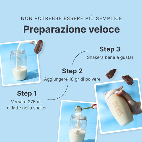 Il tuo Shake è pronto in soli tre passaggi: versa 275 ml di latte parzialmente scremato (1,5% di grassi) nello shaker. Aggiungi 18 g di preparato (circa 2 cucchiai colmi o 2 misurini rasi). Agita bene il tutto.