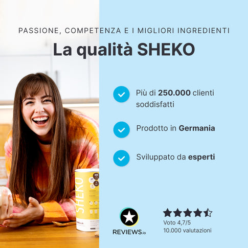 Nell'ambito di una dieta ipocalorica, sostituire due dei pasti principali giornalieri con un frullato SHEKO contribuisce alla perdita di peso, mentre sostituire un solo pasto principale al giorno aiuta a mantenere il peso raggiunto. Lo shake SHEKO soddisfa lo scopo di controllo del peso solo nell'ambito di una dieta ipocalorica e se si consumano anche altri alimenti. Assicurati di seguire una dieta varia ed equilibrata e uno stile di vita sano. È importante bere ogni giorno una quantità sufficiente di acqua o tè non zuccherato.