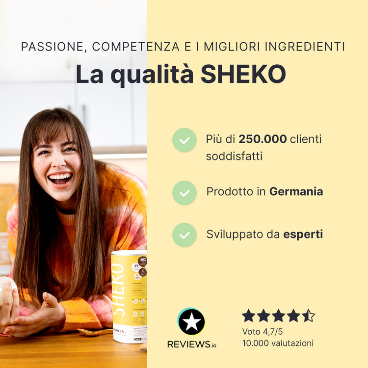 Nell'ambito di una dieta ipocalorica, sostituire due dei pasti principali giornalieri con un frullato SHEKO contribuisce alla perdita di peso, mentre sostituire un solo pasto principale al giorno aiuta a mantenere il peso raggiunto. Lo shake SHEKO soddisfa lo scopo di controllo del peso solo nell'ambito di una dieta ipocalorica e se si consumano anche altri alimenti. Assicurati di seguire una dieta varia ed equilibrata e uno stile di vita sano. È importante bere ogni giorno una quantità sufficiente di acqua o tè non zuccherato.