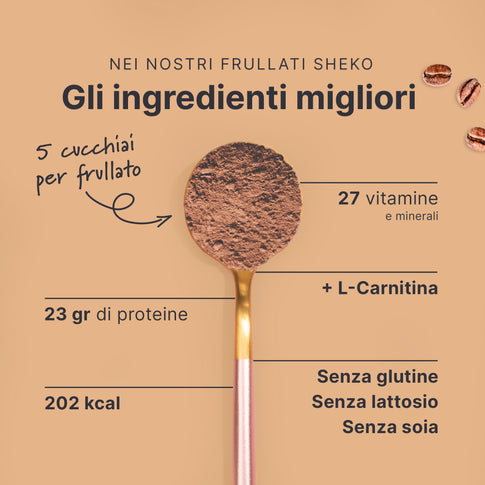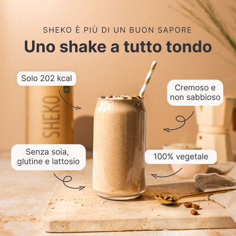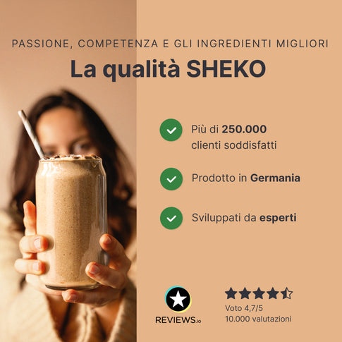 Nell'ambito di una dieta ipocalorica, sostituire due dei pasti principali giornalieri con un frullato SHEKO contribuisce alla perdita di peso, mentre sostituire un solo pasto principale al giorno aiuta a mantenere il peso raggiunto. Lo shake SHEKO soddisfa lo scopo di controllo del peso solo nell'ambito di una dieta ipocalorica e se si consumano anche altri alimenti. Assicurati di seguire una dieta varia ed equilibrata e uno stile di vita sano. È importante bere ogni giorno una quantità sufficiente di acqua o tè non zuccherato.