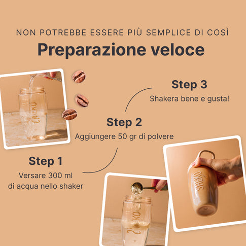 Il frullato è pronto in soli tre passaggi: versare 300 ml di acqua nello shaker. Aggiungere 50 gr di polvere (circa 5 cucchiai colmi o 5 misurini rasi). Agitare bene il tutto. Pronto per essere gustato!