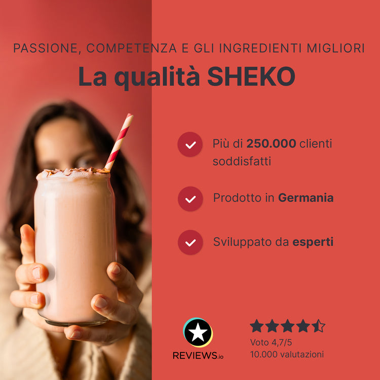 Nell'ambito di una dieta ipocalorica, sostituire due dei pasti principali giornalieri con un frullato SHEKO contribuisce alla perdita di peso, mentre sostituire un solo pasto principale al giorno aiuta a mantenere il peso raggiunto. Lo shake SHEKO soddisfa lo scopo di controllo del peso solo nell'ambito di una dieta ipocalorica e se si consumano anche altri alimenti. Assicurati di seguire una dieta varia ed equilibrata e uno stile di vita sano. È importante bere ogni giorno una quantità sufficiente di acqua o tè non zuccherato.