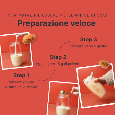 Il tuo Shake è pronto in soli tre passaggi: versa 275 ml di latte parzialmente scremato (1,5% di grassi) nello shaker. Aggiungi 18 g di preparato (circa 2 cucchiai colmi o 2 misurini rasi). Agita bene il tutto.