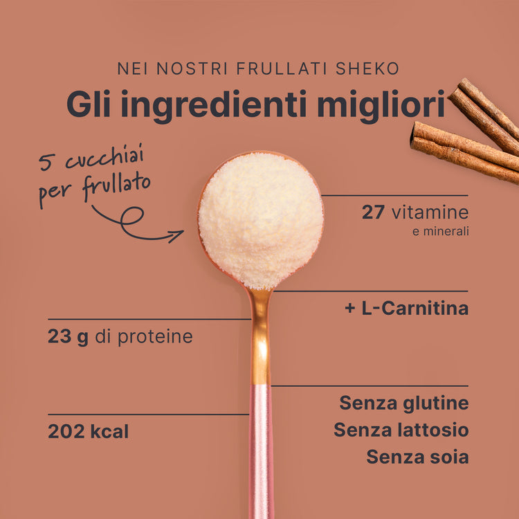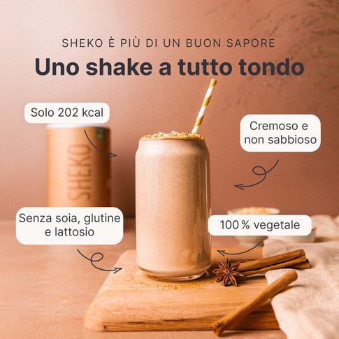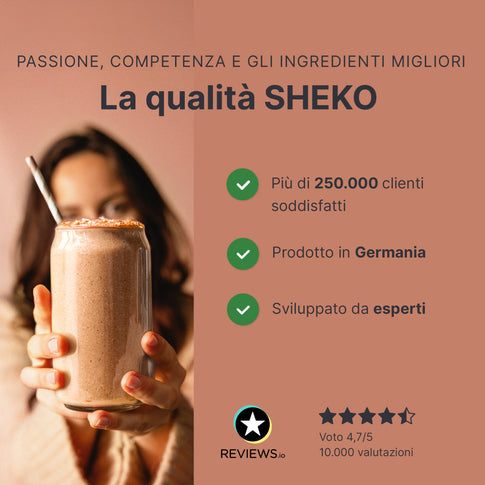 Nell'ambito di una dieta ipocalorica, sostituire due dei pasti principali giornalieri con un frullato SHEKO contribuisce alla perdita di peso, mentre sostituire un solo pasto principale al giorno aiuta a mantenere il peso raggiunto. Lo shake SHEKO soddisfa lo scopo di controllo del peso solo nell'ambito di una dieta ipocalorica e se si consumano anche altri alimenti. Assicurati di seguire una dieta varia ed equilibrata e uno stile di vita sano. È importante bere ogni giorno una quantità sufficiente di acqua o tè non zuccherato.