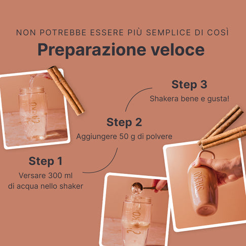 Il frullato è pronto in soli tre passaggi: versare 300 ml di acqua nello shaker. Aggiungere 50 gr di polvere (circa 5 cucchiai colmi o 5 misurini rasi). Agitare bene il tutto. Pronto per essere gustato!