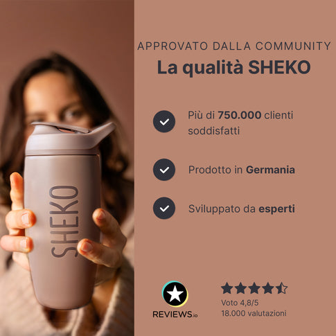 Lo shaker arriva fino a 550 ml - perfetto per una porzione del tuo frullato SHEKO preferito + qualche cubetto di ghiaccio, collagene, frutta congelata o qualsiasi altra cosa ti faccia battere il cuore. Nei giorni in cui il tuo corpo ha semplicemente bisogno di più, puoi anche preparare più shake. Ad esempio, 3 cucchiai di polvere in 400 ml di latte magro. Tieni solo presente che i valori nutrizionali e le calorie possono cambiare.