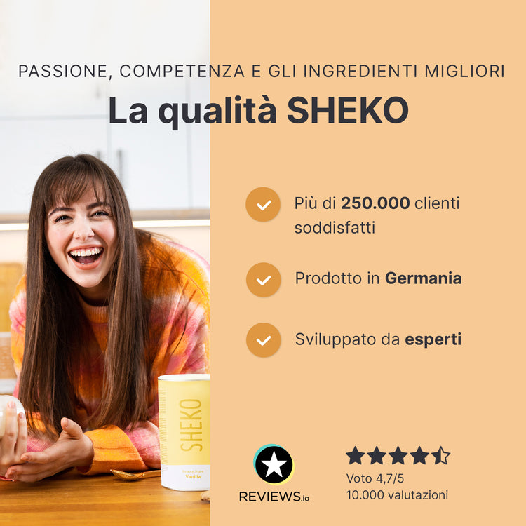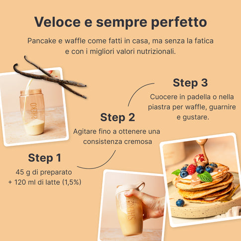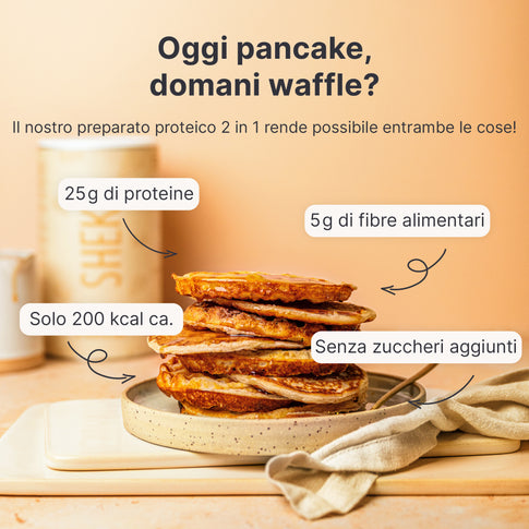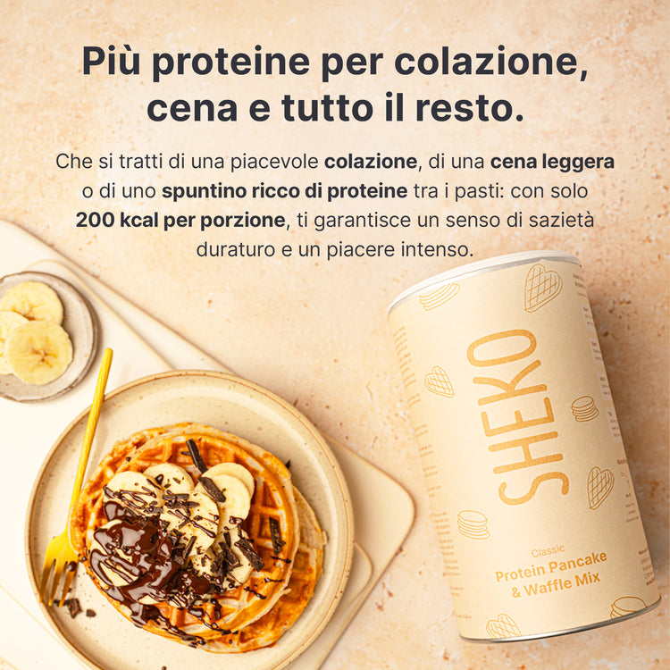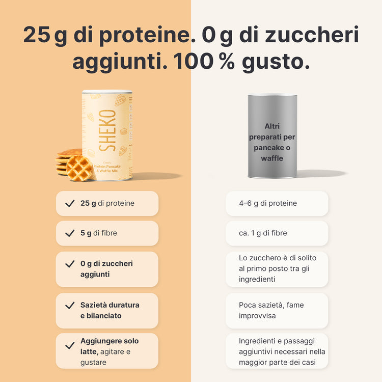 La nostra nuova miscela per pancake e waffle proteici unisce tutto ciò che ami di SHEKO: gusto naturale, valori nutrizionali ottimi e massima semplicità d'uso. Con 25 g di proteine e 5 g di fibre per porzione, sazia in modo rapido e duraturo.