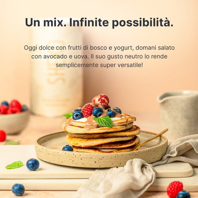 Il gusto neutro rende la miscela particolarmente versatile. Preferisci i pancake o i waffle dolci o salati? A te la scelta! Abbinali ai tuoi condimenti preferiti: ad esempio dolci con frutti di bosco, yogurt e crema di noci o salati con avocado, uova o formaggio. Una base, infinite possibilità.