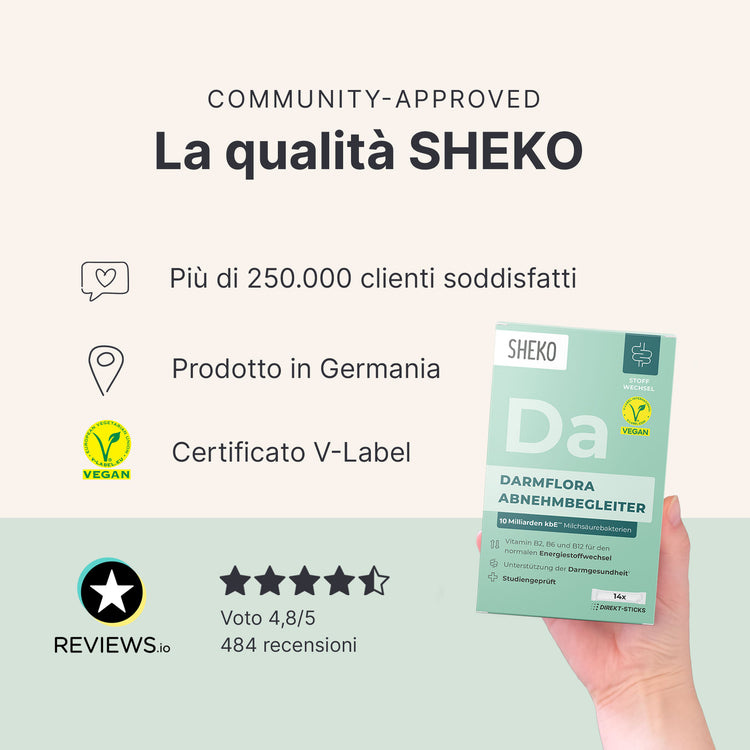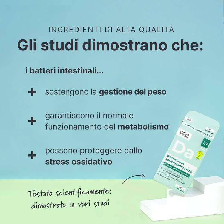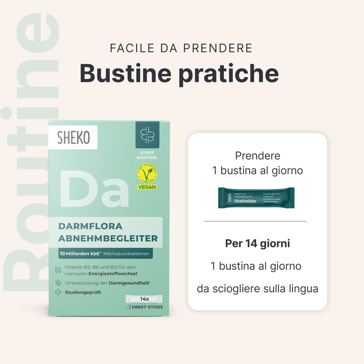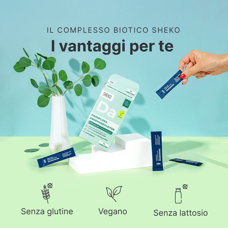 Una flora intestinale sana scioglie i depositi di grasso, riduce l'appetito e può migliorare il nostro umore. Solo chi ha una flora intestinale che funziona al meglio può rimanere magro a lungo termine. È qui che entra in gioco il nostro integratore per la regolazione della flora intestinale SHEKO.