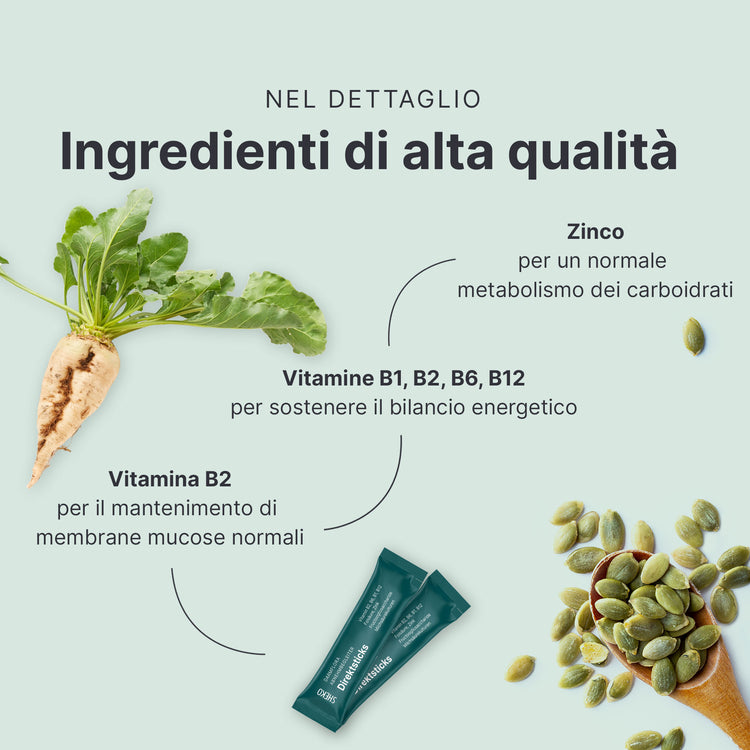 Una flora intestinale sana è importante per la digestione e può anche influenzare il nostro metabolismo. Il nostro complesso di vitamine B e l'acido folico svolgono un ruolo centrale nel metabolismo energetico, ossia nella conversione del cibo in energia. Anche lo zinco è coinvolto nel metabolismo dei carboidrati, dei grassi e delle proteine nell'organismo.