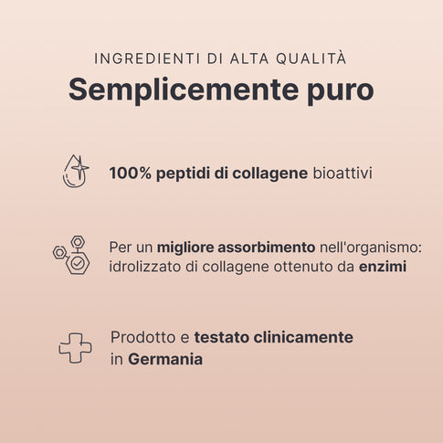 A partire dai 25 anni, il nostro corpo inizia a produrre meno collagene; questo può portare a segni visibili di invecchiamento e, tra l'altro, alla debolezza del tessuto connettivo. Gli studi hanno dimostrato che il VERISOL® in esso contenuto aumenta l'elasticità della pelle (1). È particolarmente utile per sostenere l'elasticità della pelle quando si perde molto peso, per evitare il più possibile il cedimento della pelle.