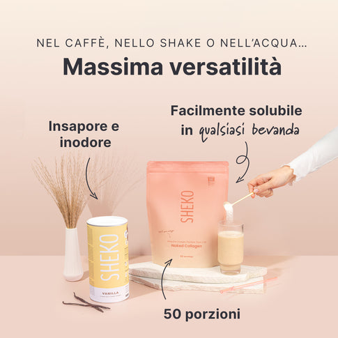 L'invecchiamento non riguarda solo la bellezza esteriore. Il collagene costituisce il 30% delle proteine del nostro corpo. Se la produzione naturale di collagene diminuisce a partire dai 25 anni di età, si verifica la formazione di rughe, tessuto connettivo debole, unghie, capelli e ossa deboli, oltre a dolori e rigidità delle articolazioni. È qui che entrano in gioco il Naked Collagene, con 3 tipi di collagene selezionati, e i nostri Balance Shakes, con 27 vitamine e minerali. Perché articolazioni e ossa rafforzate ci permettono di rimanere in forma più a lungo e di godere di tutte le cose belle della vita il più a lungo possibile. È sufficiente mescolare 10 gr di Naked Collagen nel vostro frullato una volta al giorno: rimarrà gustoso e delizioso come sempre. 😋