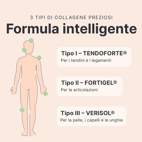 "Solo" collagene, niente di più. Ci affidiamo a peptidi di collagene di alta qualità al 100%, senza altri fronzoli. Al contrario, si tratta di un complesso intelligente e geniale con 3 diversi tipi di collagene (tipo I, II e III) che coprono aree diverse.