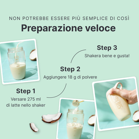 Il tuo Shake è pronto in soli tre passaggi: versa 275 ml di latte parzialmente scremato (1,5% di grassi) nello shaker. Aggiungi 18 g di preparato (circa 2 cucchiai colmi o 2 misurini rasi). Agita bene il tutto.