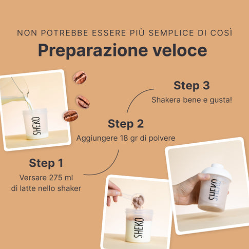 Il tuo Shake è pronto in soli tre passaggi: versa 275 ml di latte parzialmente scremato (1,5% di grassi) nello shaker. Aggiungi 18 g di preparato (circa 2 cucchiai colmi o 2 misurini rasi). Agita bene il tutto.