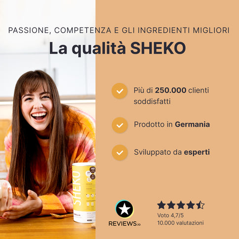 Con SHEKO non ci sono cibi proibiti! Noi pensiamo che: Il piacere e la leggerezza fanno parte del sentirsi bene. Ecco perché siamo grandi fan della regola 80/20. Mangiate una dieta sana per l'80% del tempo e godetevi esattamente ciò di cui non volete e non dovete fare a meno nel restante 20%. I pasti che non sostituite con il nostro frullato dovrebbero essere il più possibile equilibrati, cioè contenere molte proteine, una varietà di verdure colorate e grassi sani. Nella nostra galleria di ricette troverete molte idee di ricette deliziose per organizzare pasti sani e variati!