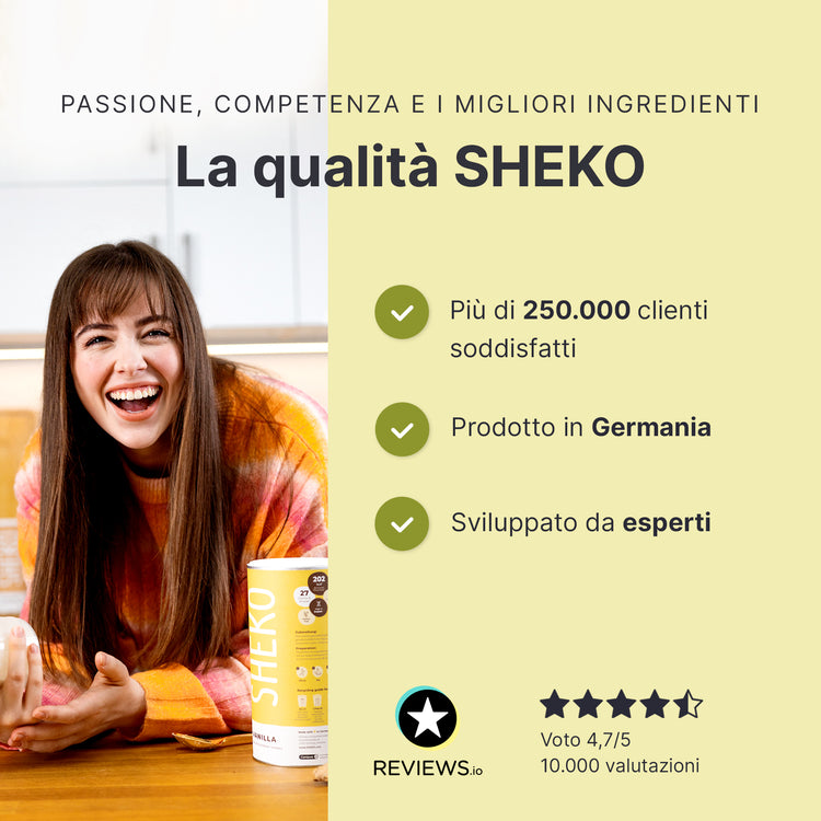 Nell'ambito di una dieta ipocalorica, sostituire due dei pasti principali giornalieri con un frullato SHEKO contribuisce alla perdita di peso, mentre sostituire un solo pasto principale al giorno aiuta a mantenere il peso raggiunto. Lo shake SHEKO soddisfa lo scopo di controllo del peso solo nell'ambito di una dieta ipocalorica e se si consumano anche altri alimenti. Assicurati di seguire una dieta varia ed equilibrata e uno stile di vita sano. È importante bere ogni giorno una quantità sufficiente di acqua o tè non zuccherato.