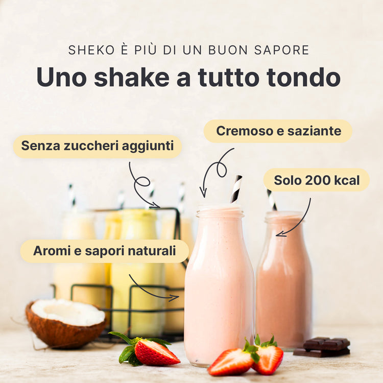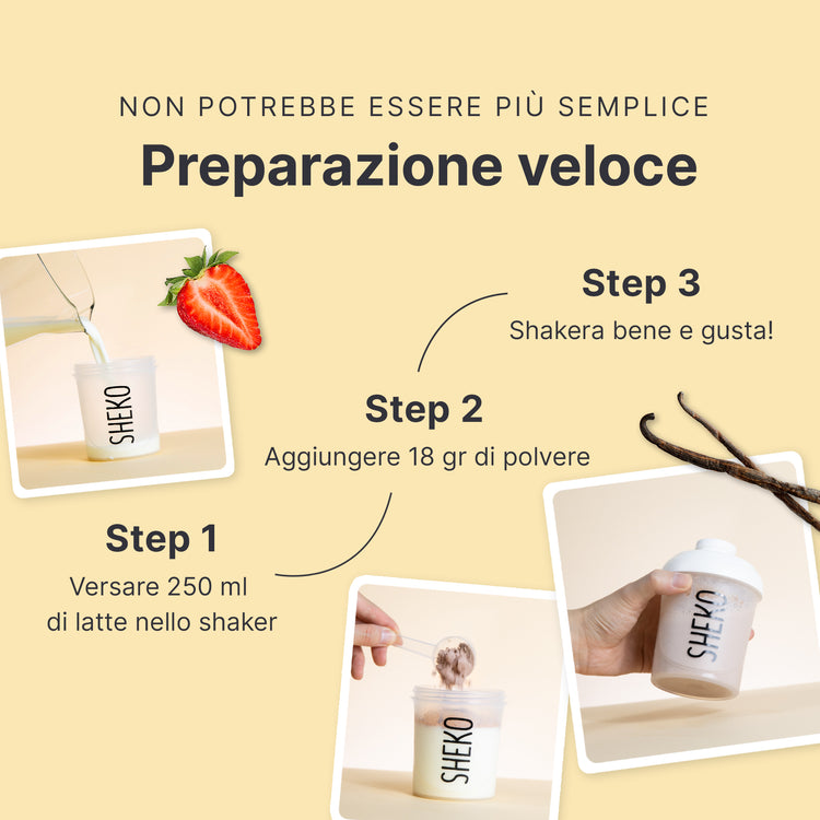 Nell'ambito di una dieta ipocalorica, sostituire due dei pasti principali giornalieri con un frullato SHEKO contribuisce alla perdita di peso, mentre sostituire un solo pasto principale al giorno aiuta a mantenere il peso raggiunto. Lo shake SHEKO soddisfa lo scopo di controllo del peso solo nell'ambito di una dieta ipocalorica e se si consumano anche altri alimenti. Assicurati di seguire una dieta varia ed equilibrata e uno stile di vita sano. È importante bere ogni giorno una quantità sufficiente di acqua o tè non zuccherato.