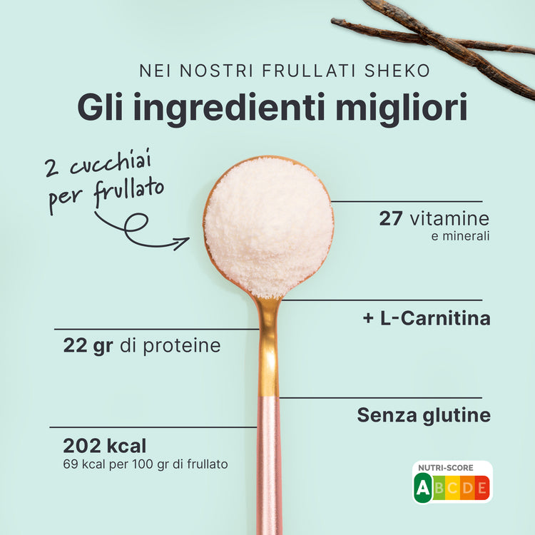 Nell’ambito di una dieta ipocalorica, sostituire due dei pasti principali giornalieri con un frullato Balance Shake SHEKO aiuta a dimagrire, mentre sostituire un pasto principale al giorno aiuta a mantenere il peso forma. Lo shake SHEKO permette di controllare il peso solo se rientra in un’alimentazione ipocalorica e se si consumano anche altri alimenti. Assicurati di associare un’alimentazione varia ed equilibrata a uno stile di vita sano. È importante che tu beva molta acqua o tisane non zuccherate ogni giorno.