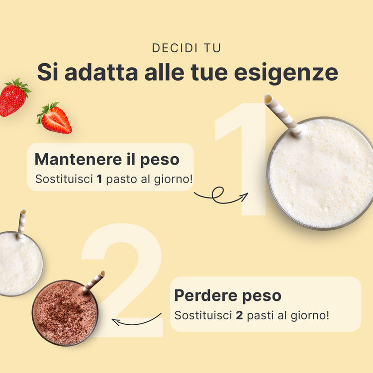 Con il set di 1 mese puoi sostituire circa 63 pasti, l’equivalente di 2 shake al giorno per più di 4 settimane per perdere peso, altrimenti 1 frullato al giorno per 8 settimane per mantenere il peso raggiunto. È l’ideale per cominciare con equilibrio e costanza!