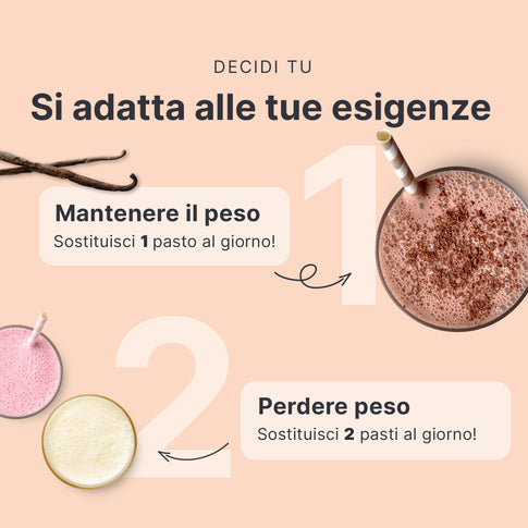 Se vuoi mantenere il tuo peso corporeo,sostituisci 1 pastoal giorno con il nostro frullato, che sia colazione, pranzo o cena.