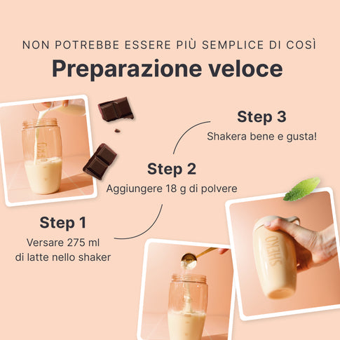 Il tuo Shake è pronto in soli tre passaggi: versa 275 ml di latte parzialmente scremato (1,5% di grassi) nello shaker. Aggiungi 18 g di preparato (circa 2 cucchiai colmi o 2 misurini rasi). Agita bene il tutto. Pronto da gustare!