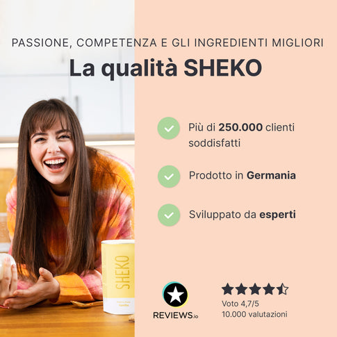 Nell'ambito di una dieta ipocalorica, sostituire due dei pasti principali giornalieri con un frullato SHEKO contribuisce alla perdita di peso, mentre sostituire un solo pasto principale al giorno aiuta a mantenere il peso raggiunto. Lo shake SHEKO soddisfa lo scopo di controllo del peso solo nell'ambito di una dieta ipocalorica e se si consumano anche altri alimenti. Assicurati di seguire una dieta varia ed equilibrata e uno stile di vita sano. È importante bere ogni giorno una quantità sufficiente di acqua o tè non zuccherato.