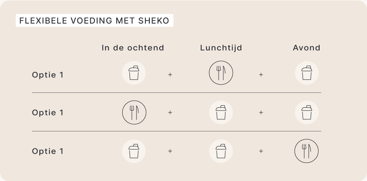 Eén ding is zeker: iedereen heeft individuele behoeften. En dat is maar goed ook. Het schema laat zien dat het gebruik van de shakes kan worden aangepast aan je individuele behoeften. Hou je van een stevig ontbijt? Blijf er dan bij en drink je SHEKO Shake 's avonds. Heb je 's middags weinig tijd? Geen probleem, want je favoriete shake voorziet je ook midden op de dag van de nodige voedingsstoffen. De vraag of je één of twee van je maaltijden vervangt door een shake is helemaal aan jou. Het is heel eenvoudig, want jij beslist waar jij je goed bij voelt.