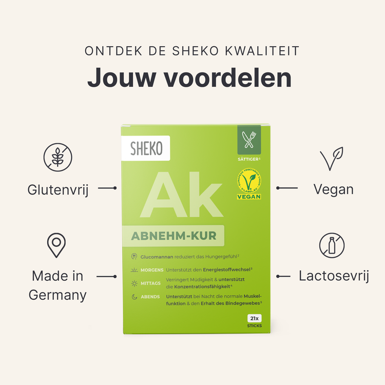 Die SHEKO Abnehmkur ist sehr gut verträglich und basiert ausschließlich auf natürlichen Inhaltsstoffen. Der pflanzliche Ballaststoff Glucomannan ist wissenschaftlich erprobt und wird in der Regel sehr gut vertragen. In seltenen Fällen kann es – insbesondere bei unzureichender Flüssigkeitszufuhr – zu einem Völlegefühl oder leichten Verdauungsbeschwerden kommen. Wichtig ist daher: Trinke immer ausreichend Wasser, damit Glucomannan optimal wirken kann.