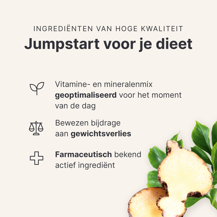 Glucomannan trägt im Rahmen einer kalorienarmen Ernährung nachweislich zum Gewichtsverlust bei. Kombiniert mit einer gezielten Auswahl an Vitaminen und Mineralstoffen, die auf die jeweilige Tageszeit abgestimmt sind, entsteht ein effektives Konzept für Deine erfolgreiche Ernährungsumstellung.