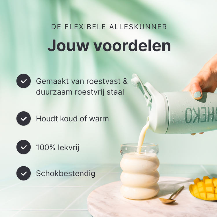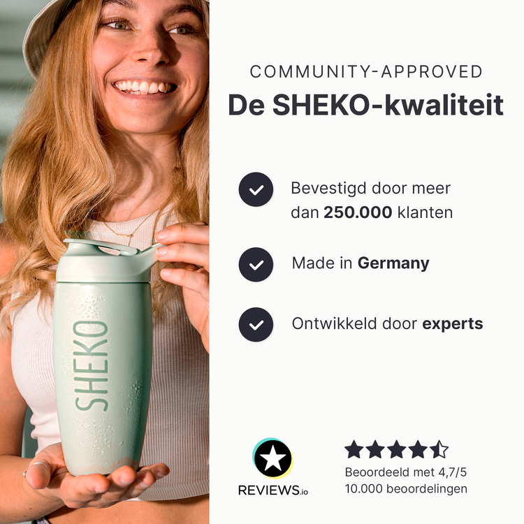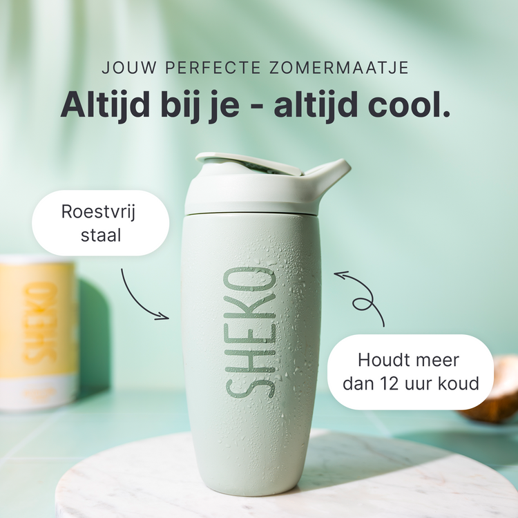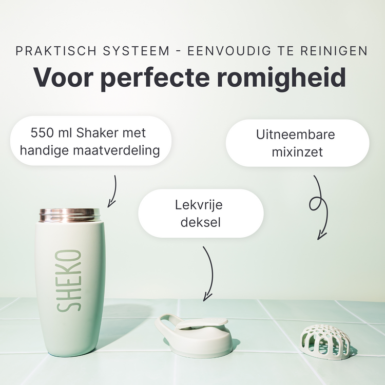 De shaker tot 550 ml - perfect voor een portie van je favoriete SHEKO shake + ijsblokjes, collageen, bevroren fruit of waar je hart ook voor klopt. Op dagen dat je lichaam simpelweg meer nodig heeft, kun je meer shakes bereiden. Bijvoorbeeld 3 eetlepels poeder op 400 ml magere melk. Houd er wel rekening mee dat ook de voedingswaarden en de hoeveelheid calorieën zullen veranderen.