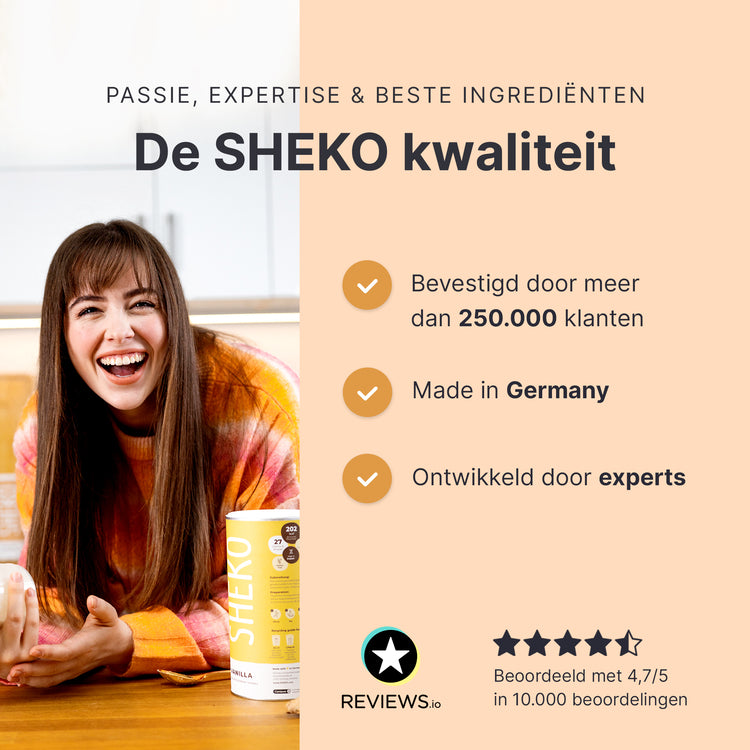 Zondig lekker, zonder schuldig geweten. Onze SHEKO Shake is uw heerlijke alternatief om eenvoudig uw persoonlijke “feel-good” zelf te bereiken. Snel geschud, vol en blij - shake gezonde maaltijden met waardevolle vitamines en hoogwaardige eiwitten. Op de bank, op de sprong of op de stepper – SHEKO is uw perfecte metgezel voor uw lichaamsdoelen!