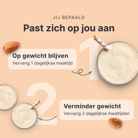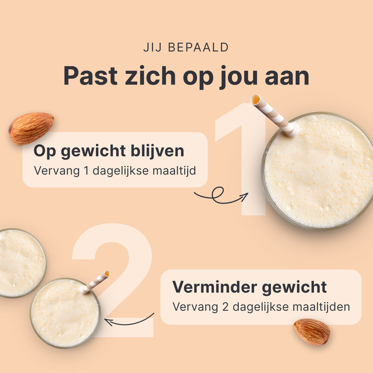 Als je je 'feel good'-gewicht wilt behouden, vervang dan 1 maaltijd per dag door onze shake. Of het nu ontbijt, lunch of diner is.