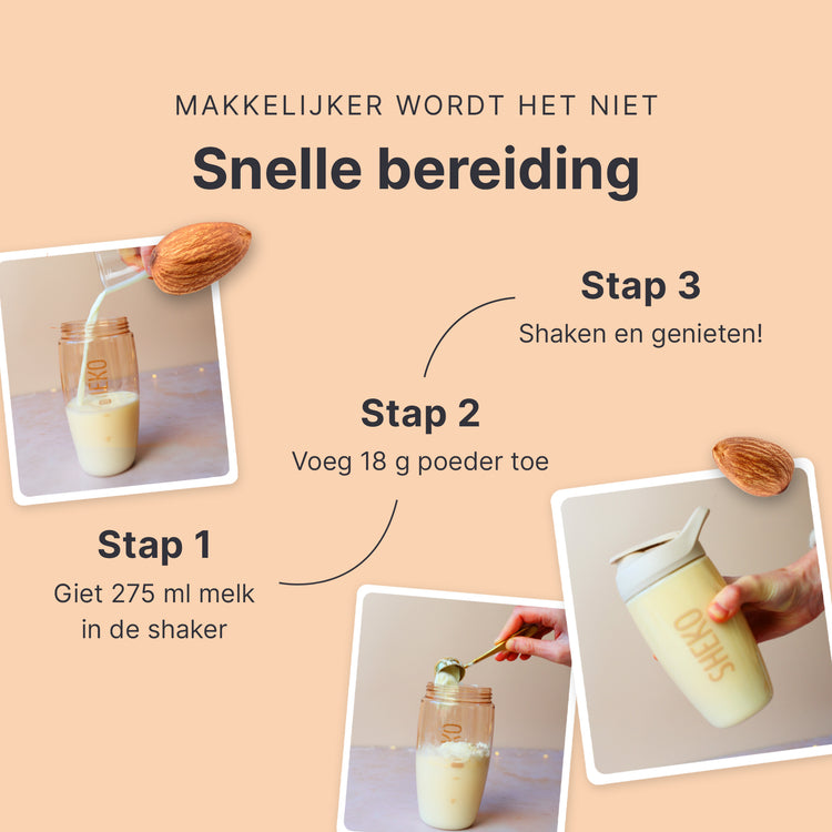 Je shake is klaar in slechts drie stappen: Giet 275 ml melk (1,5% vet) in de shaker. Voeg 18 g poeder toe (ca. 2 opscheplepels of 2 afgestreken maatlepels). Schud alles goed door. Klaar om te genieten!