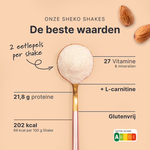 Als onderdeel van een caloriearm dieet draagt het vervangen van twee van de dagelijkse hoofdmaaltijden door een SHEKO Shake bij aan gewichtsverlies, en het vervangen van één hoofdmaaltijd per dag draagt bij aan het behouden van je gewicht. De SHEKO Shake vervult het doel van gewichtscontrole alleen in het kader van een caloriearm dieet en als je ook andere voedingsmiddelen tot je neemt. Zorg voor een gevarieerd en uitgebalanceerd dieet en een gezonde levensstijl. Het is belangrijk dat je dagelijks voldoende water of ongezoete thee drinkt.