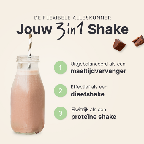 *De voedingswaarden zijn berekend met de vanillesmaak als voorbeeld. Let op: de shake is alleen een complete maaltijdvervanger met koemelk.
