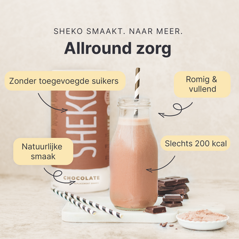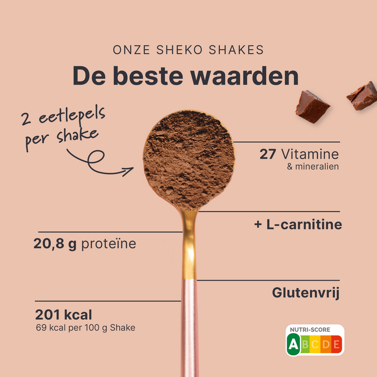 Wat je moet wetenHet vervangen van twee van je dagelijkse hoofdmaaltijden door een SHEKO shake draagt bij aan gewichtsverlies als onderdeel van een caloriearm dieet. Het vervangen van één maaltijd per... Het vervangen van twee van je dagelijkse hoofdmaaltijden door een SHEKO shake draagt bij aan gewichtsverlies als onderdeel van een caloriearm dieet. Het vervangen van één maaltijd per dag helpt je om op gewicht te blijven. De SHEKO shake werkt alleen gewichtsbeheersend als onderdeel van een caloriearm, gevarieerd en uitgebalanceerd dieet. Het is daarom belangrijk dat je ook andere voedingsmiddelen eet en de bereidingswijze volgt. Zorg voor een gezonde levensstijl en drink dagelijks voldoende water of ongezoete thee.
