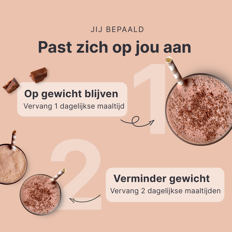 Behoud je gewichtAls je je 'feel good'-gewicht wilt behouden, vervang dan 1 maaltijd per dag door onze shake. Of het nu ontbijt, lunch of diner is.