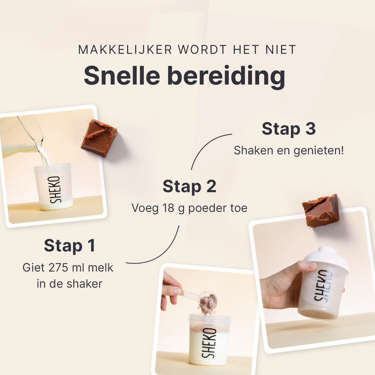 Je shake is klaar in slechts drie stappen: Giet 275 ml melk (1,5% vet) in de shaker. Voeg 18 g poeder toe (ca. 2 opscheplepels of 2 afgestreken maatlepels). Schud alles goed door. Klaar om te genieten!