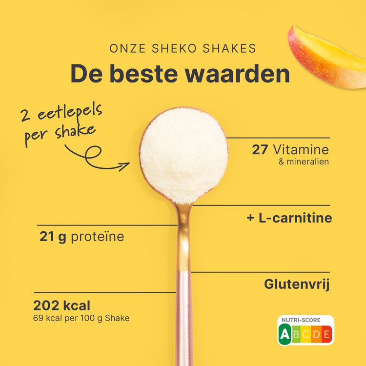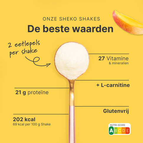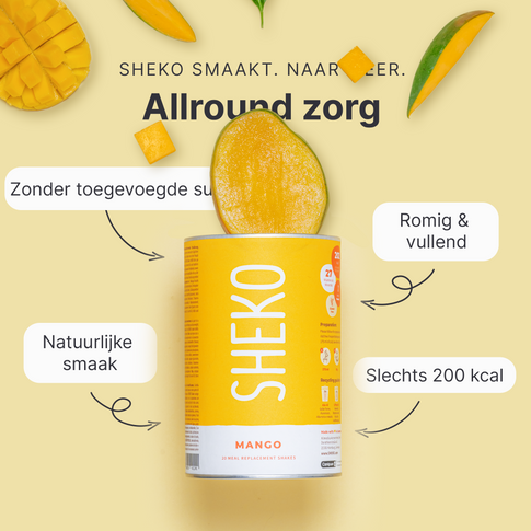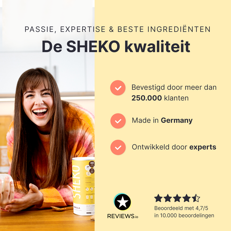 De SHEKO shake werkt alleen gewichtsbeheersend als onderdeel van een caloriearm, gevarieerd en uitgebalanceerd dieet. Het is daarom belangrijk dat je ook andere voedingsmiddelen eet en de bereidingswijze volgt. Zorg voor een gezonde levensstijl en drink dagelijks voldoende water of ongezoete thee.