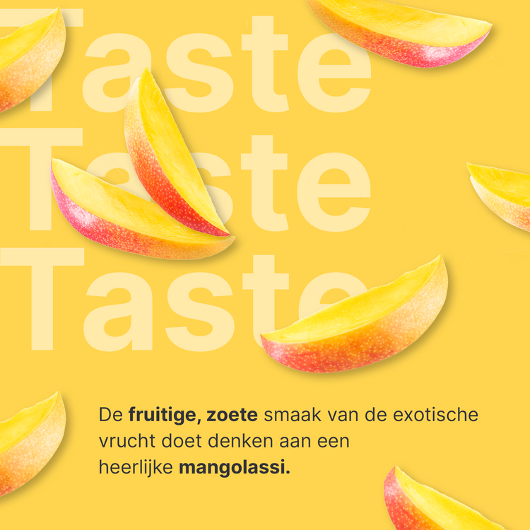 Ingrediënten: Melkeiwit, wei-eiwitconcentraat, sojaolie, maltodextrine, natuurlijk aroma, verdikkingsmiddel (xanthaangom), zuurteregelaar (citroenzuur, L(+)-wijnsteenzuur), magere-melk yoghurtpoeder, Mangovruchtenpoeder (1,0%), magnesiumoxide, L-carnitine, kaliumcitraat, keukenzout, dipotassiumfosfaat, emulgator (lecithinen (bevat soja)), kleurstof extract van cape jasmijn (Gardenia jasminoides), Vitamine C, ijzer(II)sulfaat, zoetstof (sucralose), zinkoxide, mangaan(II)sulfaat, niacine, vitamine E, koper(II)gluconaat, antioxidant (DL-alfa-tocoferol), pantotheenzuur, vitamine B6, vitamine B2, vitamine B1, vitamine A, foliumzuur, natriumjodide, natriummolybdaat, natriumseleniet, vitamine K, biotine, vitamine D, vitamine B12. Kan sporen van ei bevatten.