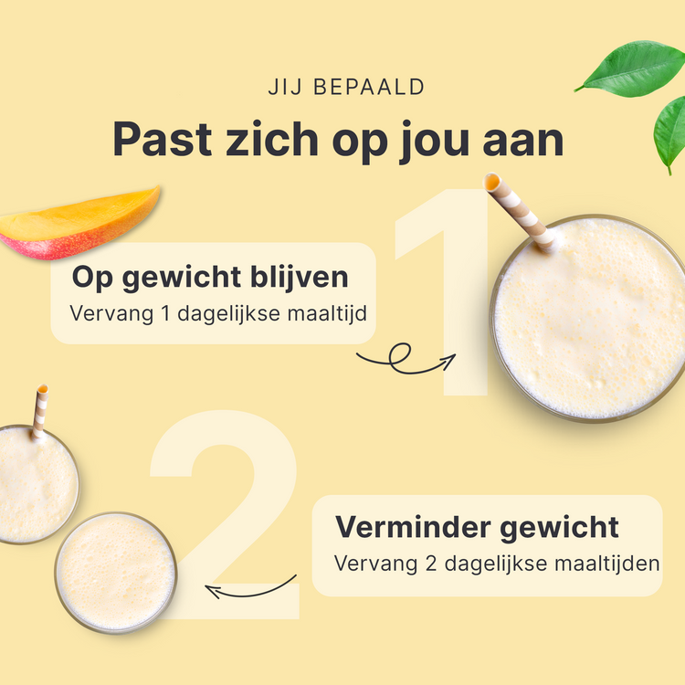 Als je je 'feel good'-gewicht wilt behouden, vervang dan 1 maaltijd per dag door onze shake. Of het nu ontbijt, lunch of diner is.