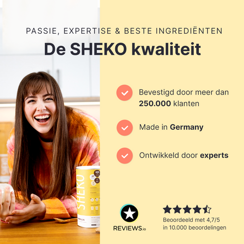 Zondig lekker, zonder schuldig geweten. Onze SHEKO Shake is uw heerlijke alternatief om eenvoudig uw persoonlijke “feel-good” zelf te bereiken. Snel geschud, vol en blij - shake gezonde maaltijden met waardevolle vitamines en hoogwaardige eiwitten. Op de bank, op de sprong of op de stepper – SHEKO is uw perfecte metgezel voor uw lichaamsdoelen